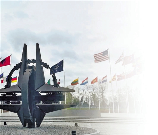 这是4月6日在比利时布鲁塞尔拍摄的北约总部的雕塑与旗帜。 新华社发