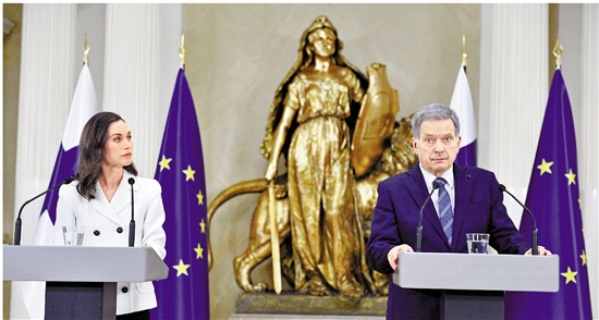 5月15日,在芬兰赫尔辛基,芬兰总统尼尼斯托(右)和总理马林参加联合记者会。