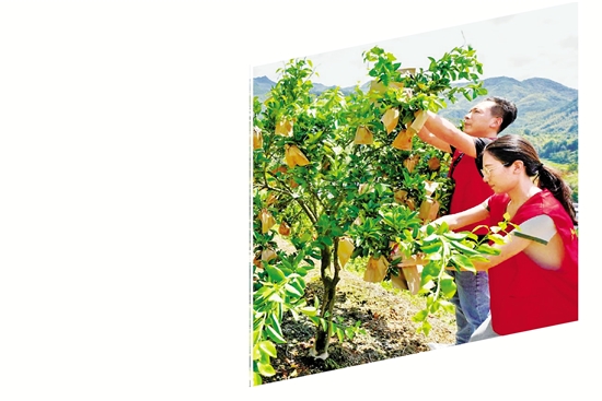 淤上乡外童村村干部和村民为甜桔柚幼果进行套袋防虫。 拍友 陈炜 摄
