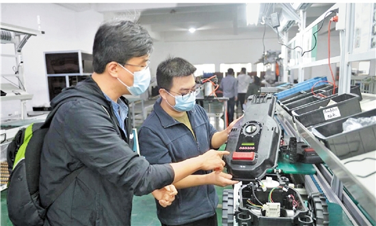 工程师向记者(左)介绍智能割草机的外观设计。 共享联盟永康站 杨成栋 摄