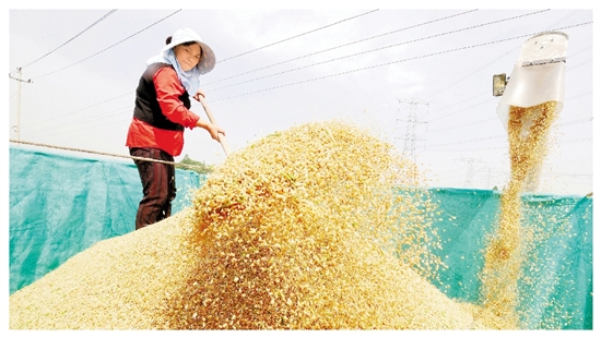 5月18日,在湖州市德清县新市镇谷门村,农民在抢收小麦。近年来,德清县全力推进粮食生产功能区“非粮化”整治,推动土地集中流转和规模经营,稳定粮食生产。 拍友 谢尚国 摄