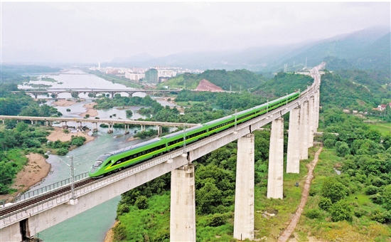 图为一辆“绿巨人”奔跑在金台铁路上。去年6月,金台铁路的开通,结束了浙江东中部山区县仙居、磐安不通铁路的历史,方便两地居民出行,走上共同富裕“快车道”(资料照片)。 拍友 王华斌 摄