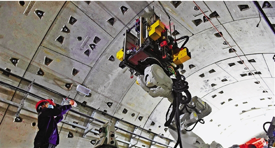 5月28日,一套智能植栓设备在杭州地铁3号线仓前停车场的隧道内调试。这套由中铁建电气化局与浙江大学联合研发的铁路施工智能装备,可自动实现在隧道壁上打孔、注入胶水、植入螺栓等操作,大大提高地铁接触网的铺设效率。图为智能植栓设备在隧道顶部打孔植栓。 本报记者 潘海松 王建龙 摄 |