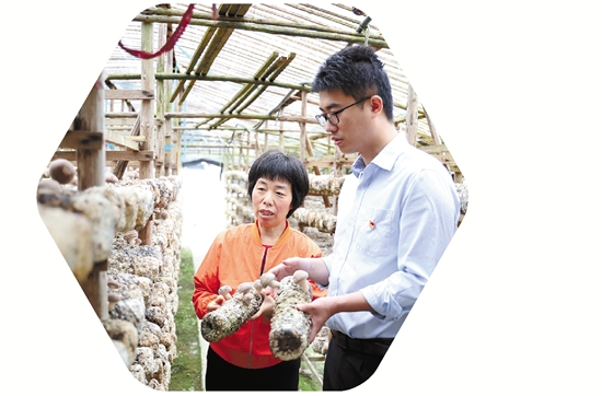 邮储银行武义县支行客户经理走访香菇种植基地,现场观察香菇生长形态,了解种植户经营中遇到的问题和困难。