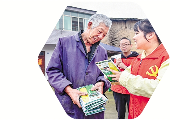 莘畈乡红盟志愿者将最新的山玉米种子、地瓜种苗送到村民手中。