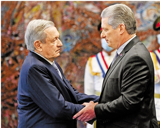 5月8日,墨西哥总统洛佩斯(左)在哈瓦那会见古巴国家主席迪亚斯-卡内尔。