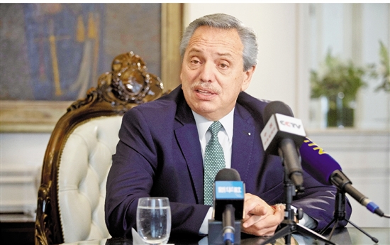 1月25日,阿根廷总统费尔南德斯在首都布宜诺斯艾利斯的总统府玫瑰宫内接受记者采访。