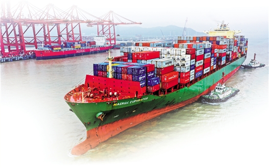 马士基幼发拉底轮靠泊宁波舟山港金塘港区大浦口集装箱码头,进行标准箱装卸作业。 拍友 姚峰 任洁 摄