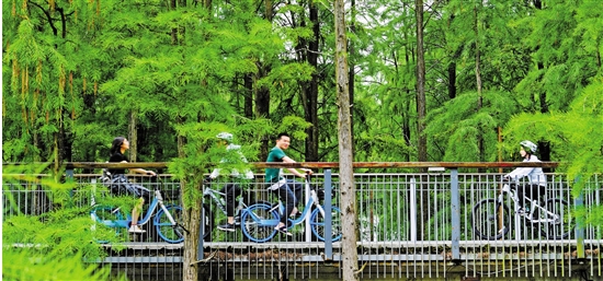 ↑位于杭州市临安区的青山湖景区在端午假期推出森林生活季活动。图为6月5日,游客到该景区游玩。