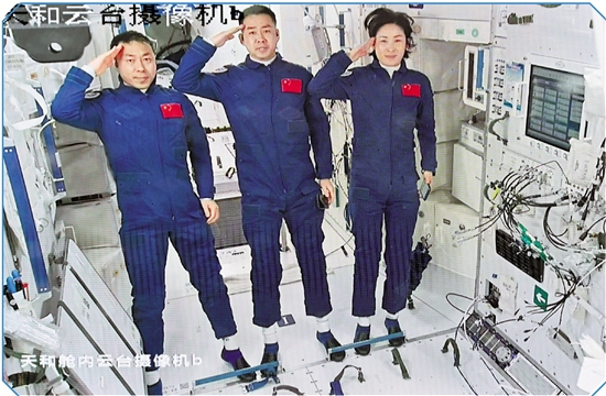 6月5日在北京航天飞行控制中心拍摄的进驻天和核心舱的航天员陈冬(中)、刘洋(右)、蔡旭哲向全国人民敬礼的画面。