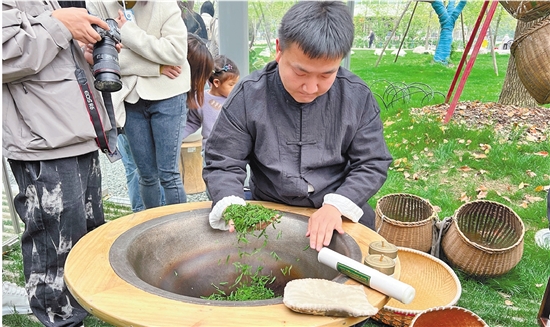 满觉陇村陈骏辰展示西湖龙井茶炒制过程