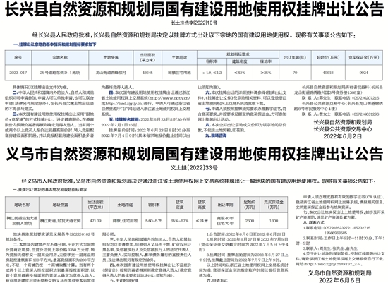 挂牌报价时间:2022年6月23日8时30分至2022年7月4日9时(具体每宗地报价截止时间以出让须知为准)。