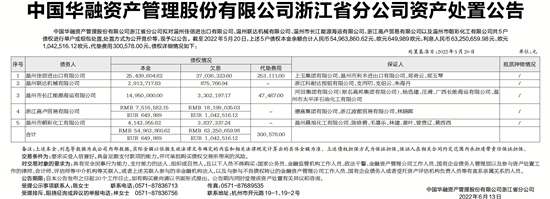 中国华融资产管理股份有限公司浙江省分公司资产处置公告