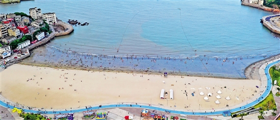连日来我省持续晴热高温。7月8日傍晚时分,在玉环市坎门后沙沙滩,游客在海滨浴场尽情戏水消暑、游玩。 拍友 段俊利 摄