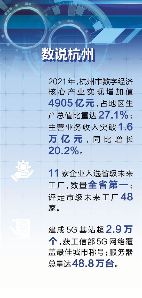 2021年,杭州市数字经济核心产业实现增加值4905亿元,占地区生产总值比重达27.1%;主营业务收入突破1.6万亿元,同比增长20.2%。