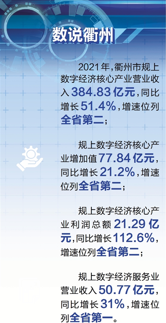 2021年,衢州市规上数字经济核心产业营业收入384.83亿元,同比增长51.4%,增速位列全省第二;