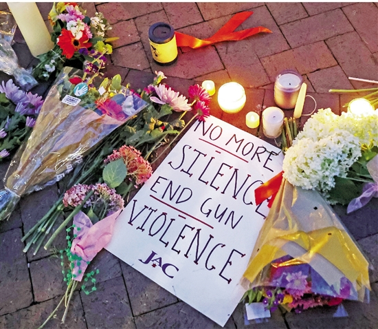 7月5日,在美国伊利诺伊州海兰帕克市,悼念者摆放写着“不再沉默,停止枪支暴力”的标语牌。