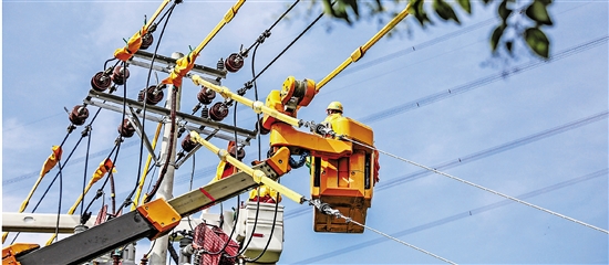 7月15日,带电作业抢修小组在位于杭州市临安区太阳镇杨岭脚村的供电故障点抢修。上午9时左右,烈日炎炎,两名作业人员操作绝缘斗臂车升至15米的高空进行作业。 拍友 胡建强 何超琪 摄