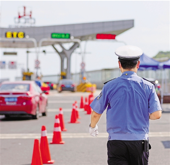 舟岱大桥双合执勤卡点,岱山县公安局交警大队一名交警的“湿身”背影。
