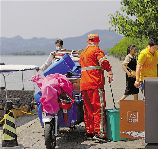 杭州一名环卫工人顶着烈日在西湖白堤上清理垃圾。