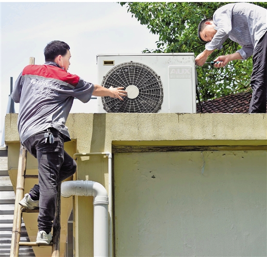 宁波市海曙区的两名空调维修工人头顶烈日在房顶检修室外机。