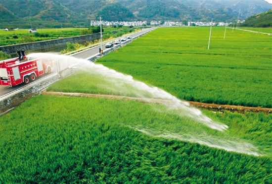 淳安县威坪镇党员志愿者正在洒水浇灌农田。林张亮 摄