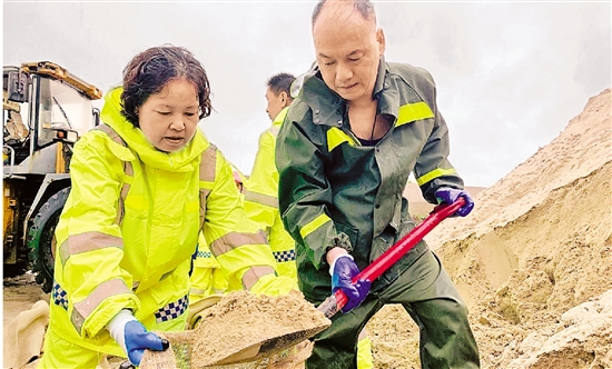 9月3日,宁波市海曙区洞桥镇树桥村党员志愿者赶到鄞江堤防整治工程(一期)现场,利用防汛应急沙袋封堵缺口,全力防范台风“轩岚诺”。 本报记者 应磊 通讯员 徐慧琳 摄