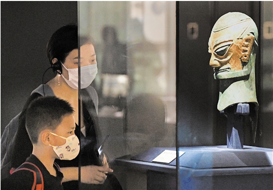 日前开始,“繁星盈天——中国百年百大考古发现展”在郑州博物馆文翰街馆面向公众展出。本次展览以“百年百大考古发现”为主线,通过中国百年来100处考古发现出土的代表性文物,集中展示中国考古百年发展历程和取得的辉煌成就。图为9月4日,参观者观看展品“戴金面罩青铜人头像”。 新华社记者 李安 摄 |