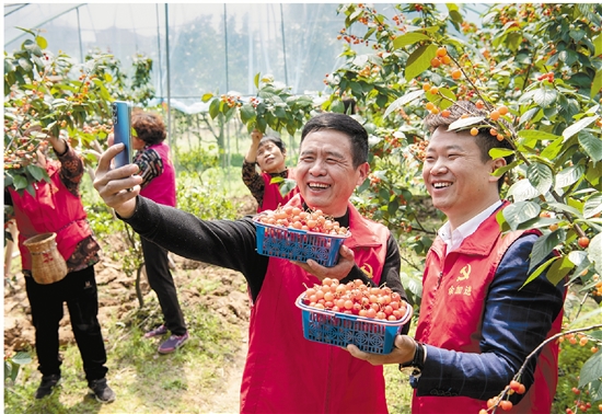 在金东区赤松镇虎岩村,党员志愿者帮助农户吆喝卖樱桃。 邵勤旦 摄