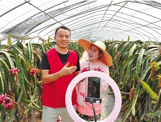 | 直播助农 日前,南浔区双林镇向阳村一水果园内,当地党员志愿者正在大棚内直播,帮果农卖力吆喝,推销火龙果。受前期天气影响,不少果园水果滞销,当地党员在田间地头以直播带货的方式,为果农尽快打开销路,挽回损失。 张斌 文/摄 |