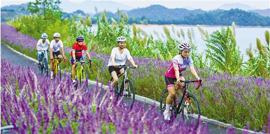 9月23日,游客在淳安县千岛湖环湖绿道骑行,一路湖光山色,景色如画。千岛湖环湖绿道全长150公里,80%依湖而修,由淳杨线绿道、千汾线绿道和排岭半岛绿道组成。 拍友 王建才 摄