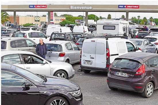 10月10日,在法国南部蒙彼利埃市附近一处加油站,司机排队等待加油。受需求激增、油企工人罢工影响,法国近五分之一加油站近期遭遇油荒。 新华社发