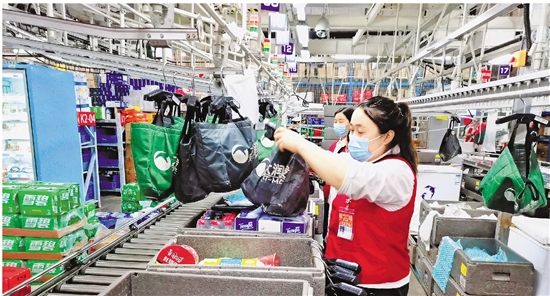 大润发超市北仑店在处理线上订单,打包、配送到市民手中。 共享联盟·北仑 蔡晓馨 摄