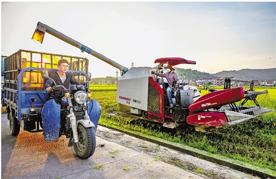 谢冲聪(左)驾驶三轮摩托车运输稻谷。 受访人供图