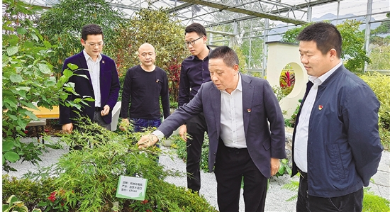 金溪生态共富产业园内,金峨村党支部书记周康健(右二)向其他村书记介绍苗木新品种。 本报记者 周文丹 摄