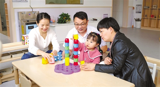 在杭州钱塘区白杨街道邻里社区幸福里幼儿园,王志强(左二)陪女儿玩游戏。本报记者 黄珍珍 摄