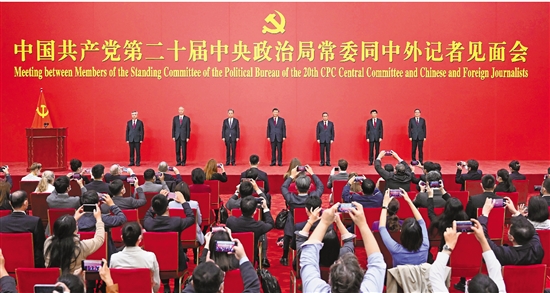 10月23日,刚刚在中国共产党第二十届中央委员会第一次全体会议上当选的中共中央总书记习近平和中共中央政治局常委李强、赵乐际、王沪宁、蔡奇、丁薛祥、李希在北京人民大会堂同采访中共二十大的中外记者亲切见面。