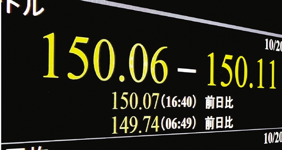 10月20日,东京外汇市场日元对美元汇率一度跌破150比1,刷新1990年8月以来最低点。图为在日本东京拍摄的日元对美元汇率信息显示屏。 新华社发