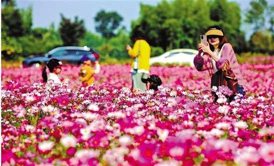 这些天,在长兴县和平镇琛碛村,百亩格桑花竞相盛开,吸引周边游客前来游玩。 拍友 许旭 摄