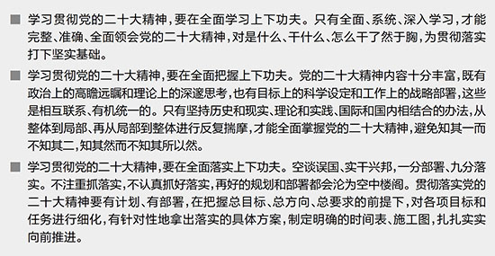 ■ 学习贯彻党的二十大精神,要在全面学习上下功夫。只有全面、系统、深入学习,才能完整、准确、全面领会党的二十大精神,对是什么、干什么、怎么干了然于胸,为贯彻落实打下坚实基础。