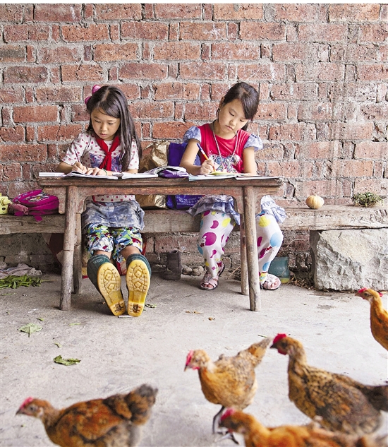 2012年9月7日,周鑫钗(右)、周妹钗两姐妹在万阜乡柘洋村家里做作业。