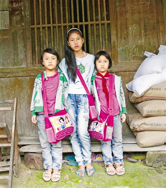 2012年9月20日,青田万阜乡家里,刚放学的双胞胎姐妹杨安妮、杨雅妮(左一)和姐姐杨晨曦。