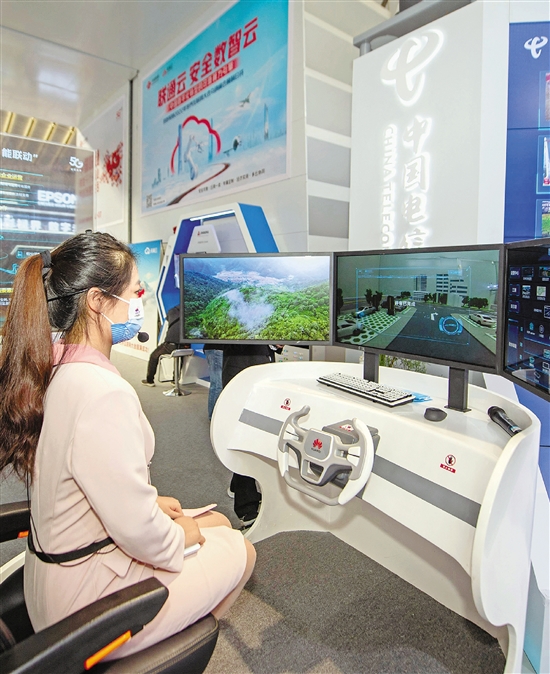 11月10日,中国电信展台工作人员演示无人驾驶系统的运行。
