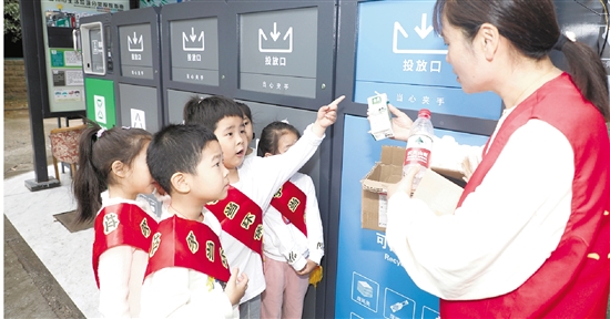 | 爱护环境,人人有责。近日,吴兴区东林镇中心幼儿园的党员教师带领孩子们参加了“垃圾分类,你我同行”的主题活动。师生们来到社区垃圾站,了解垃圾分类回收站的作用,以及怎么样正确分类投放。通过活动,孩子们认识到了垃圾分类的重要性,从小树立起环境保护意识。 赵潇潇 摄 |