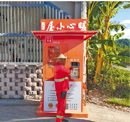 环卫工人在“暖心小屋”取用茶水