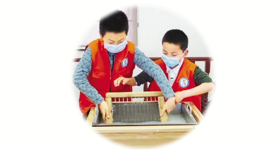 ▶ 宋纸研学活动中,学生体验造纸。