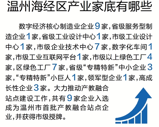 数字经济核心制造业企业9家,省级服务型制造企业1家,省级工业设计中心1家,市级工业设计中心1家,市级企业技术中心7家,数字化车间1家,市级工业互联网平台1家,市级以上绿色工厂4家,区绿色工厂7家,省级“专精特新”中小企业3家,“专精特新”小巨人1家,领军型企业1家,高成长性企业3家。大力推动产教融合站点建设工作,共有9家企业入选成为温州市首批产教融合站点企业,并获得市级授牌。
