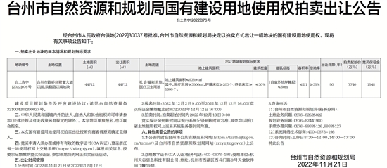 经台州市人民政府台供地[2022]30037号批准,台州市自然资源和规划局决定以拍卖方式出让一幅地块的国有建设用地使用权。现将有关事项公告如下: