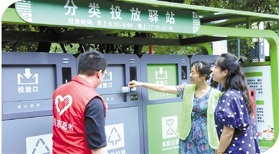 志愿者在小区分类驿站旁进行督导