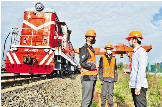 浙江人保财险为“义新欧”班列提供保险保障,实现了国际铁路运单有物权、能融资,释放了铁路运单的物权价值。图为人保财险工作人员正在班列现场服务。